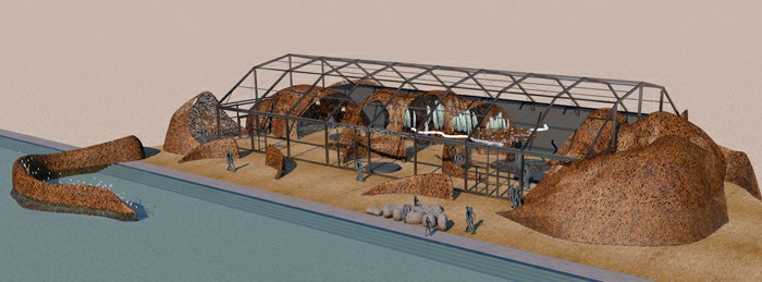 The journey starts under the orange light tree then invites us to pass under the up side down garden with his two giant anacondas facing three dancing birds flying over the hills landscape. In a second time we discover the Dome's constellation made of a recycled brushed.The main stage hosting the artists is framed by amazing fountains in sprays of metal shimmering blue.Then we turn over a cloudy landscape where we can observe a monkey, peacefully sited on the land.The journey continues in a vault inhabited by luminous headdresses which leads us outside to a flock of mocking birds. From the terrace facing the sea, behind the bamboo hills appears Doha'skyline.