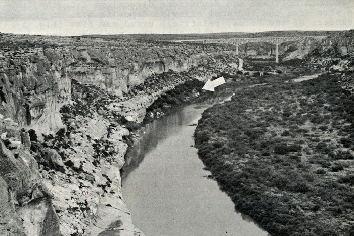 The film is complemented by immersive installations of surveying flags and tools; several series of drawings and collages; and a collection of watercolors from the 1930s by artists and amateur archaeologists Forrest and Lula Kirkland that depicts ancient rock art of the Lower Pecos. On loan from the Texas Archeological Research Laboratory at the University of Texas, these rarely seen plein air paintings document the original forms and vibrant colors of murals that were still visible in the 30s, before flooding, erosion, and human interaction damaged or destroyed them.