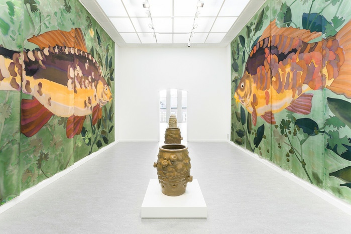 View of Daniel Dewar and Grégory Gicquel, The Wet Wing, Z33, Hasselt, Belgium, 2025. Foreground: Stoneware jar with body fragments and snails, 2024. Background: Silk painting with mirror carp, common water-crowfoot, pondweed and duckweed, 2025. Commissioned by Z33. Courtesy of the artists. Photo: Lola Pertsowsky.