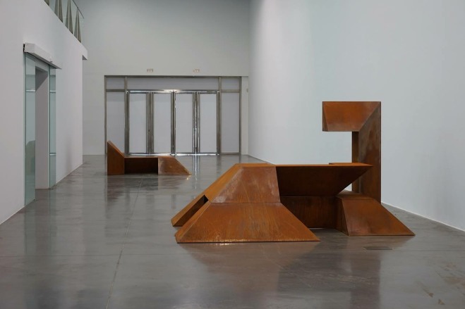 While Zarka’s rethinking of skateboarding is sustained on an ecology of critical and contemporary artistic creation, his interest in reutilisation defines the rendering of his “skateable” sculptures, designed on the basis of scientific objects by the mathematician Arthur Schönflies (1853–1928), little geometrical elements that fit together without leaving empty spaces. Zarka designed these modules by amplifying them to the scale of urban fixtures and thus enabling them to be used by skaters. These corten steel forms, whose angles and planes are perfects for skateboarding, are sculptures in their own right. In consequence, skaters have to adapt to Zarka’s sculptures in the same way as they co-