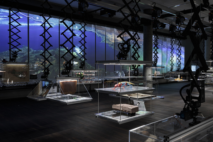 A steel grid hung underneath the ceiling facilitates a motorized pantograph system designed in collaboration with Cookies. The pantograph system, taken from the television industry, allows for 38 research objects to be brought at eye-