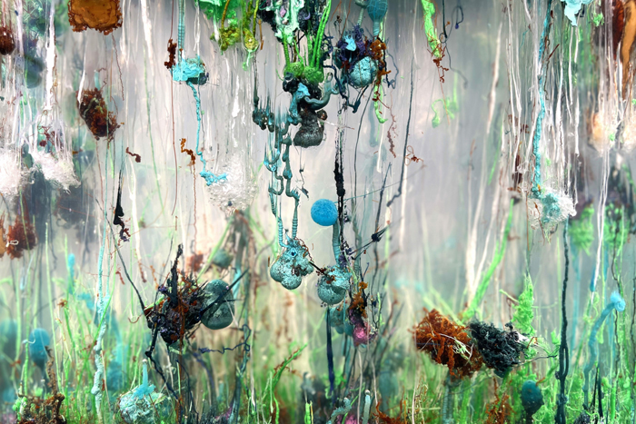 Beginning with the site-specific work Future (Invention) (2024), spread along the glass corridor leading to the luminous Henry J. and Erna D. Leir Pavilion, Kurant explores the diversity of spacial representations of futurity in various cultures through a constellation of the word “uture”translated into fourteen languages including Aymara, Maori, Darija, Malagasy and Yupno, which conceive of the future as coming from behind, above or below and not as being in front of us, as Western worldviews do. On the ground floor, Kurant investigates the impact of collective intelligence on the evolution of life forms, minerals and economic and ecological systems. The sculptures A.A.I. (System’ Negative (2016) consist of zinc casts of the interiors of termite mounds, which emerged from the inputs of millions of insects to serve as habitats of these animal worker societies. Chemical Garden (2021–ongoing) evolves throughout the duration of the exhibition, with plant-like crystalline structures emerging from a mixture of inorganic chemicals: salts of metals used as components in computers. In Alien Internet (2023, co-produced with Kunstverein Hannover), a digital-biological-geological assemblage, Kurant employs ferrofluid – a shape-shifting material invented for NASA in 1963—o model a perpetually evolving cybernetic organism, digitally controlled in an electromagnetic field and constantly altered by the behaviour and communication of millions of animals captured with digital technologies around the globe. Post-Fordite (2024) materialises a recently discovered natural-artificial geological formation, which emerged through the fossilisation of automotive paint at now-defunct car factories. Sentimentite (2022) is a new mineral that Kurant created on a molecular level by pulverising and mixing together objects used as informal or official currencies throughout human civilisation. The liquid-crystal painting Conversions (2023) physically reacts to changes in society through quasi-alchemical transmutations of energy and form. The composition and colour of the liquid crystals that make up its painted surface are constantly evolving in response to data collected with artificial intelligence algorithms from social media accounts of members of protest movements around the globe, who express ideas and emotions about changing the world and the future. Millions of people cause changes in the appearance of this artwork.