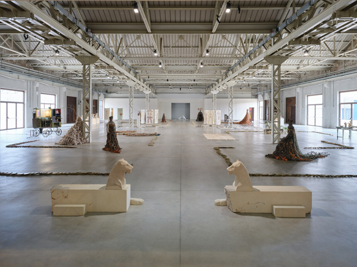 The exhibition at Pirelli HangarBicocca, curated by Lucia Aspesi and Fiammetta Griccioli, brings together the largest body of work ever presented in Italy by Chiara Camoni. With a series of new productions, it creates an architecture of collectivity and memory, whose forms are inspired by the Italian gardens of the late Renaissance and archeological sites. The symmetrical and radial design of the floor plan creates corridors and rooms, paths and environments that divide the space into several areas, in which visitors can linger or converse. The empty center is the nucleus around which the exhibition project revolves: the works are arranged as if on the bleachers of an arena, transforming the exhibition into a gathering or a performance. At the same time, the environment is designed as a physical landscape in which the boundaries between architecture, sculpture, and objects become blurred and ambiguous. While through the windows, opened for the occasion along the walls of the Shed, natural daylight gives way to dusk. This cyclical pattern is a creative and vital force, with its rhythmic sequence of moments of stillness and darkness and others animated by reflections and sunlight. Two new works, presented at the entrance and exit, open and close the exhibition in both directions. At the entryway, the visitor is welcomed by Lionesses (2024), two sculptural architectures in Lecce stone containing the remains of shells and animal bones, while at the end of the path we find the sculptural group Dogs (Bruno and Tre) (2024), two aluminum statues lying on a carpet: the figures represent a threshold, warning, and protection.