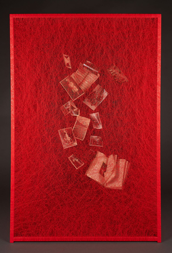 Left to right : Chiharu Shiota, A State of Being (Photo Album), 2022. Cadre en métal, album photo et fil, 120 x 80 x 45 cm Chiharu Shiota, A State of Being (Diary), 2022. Cadre en métal, agendas et fil, 80 x 45 x 45 cm