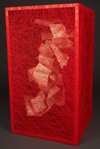 The installation is followed by a series of sculptures. Enfolded at the centre of each one, as though frozen in place by the intertwined threads, are objects from daily life. “I feel that the objects we possess are like a third skin,” she says. “We accumulate these things and transpose our presence and our memory to them.” Often obsolete, weighed down by impenetrable histories, these objects -- old suitcases, stained dolls, miniature pieces of furniture and tiny bottles -- represent the treasures offered up by memory, to be seen but not touched.