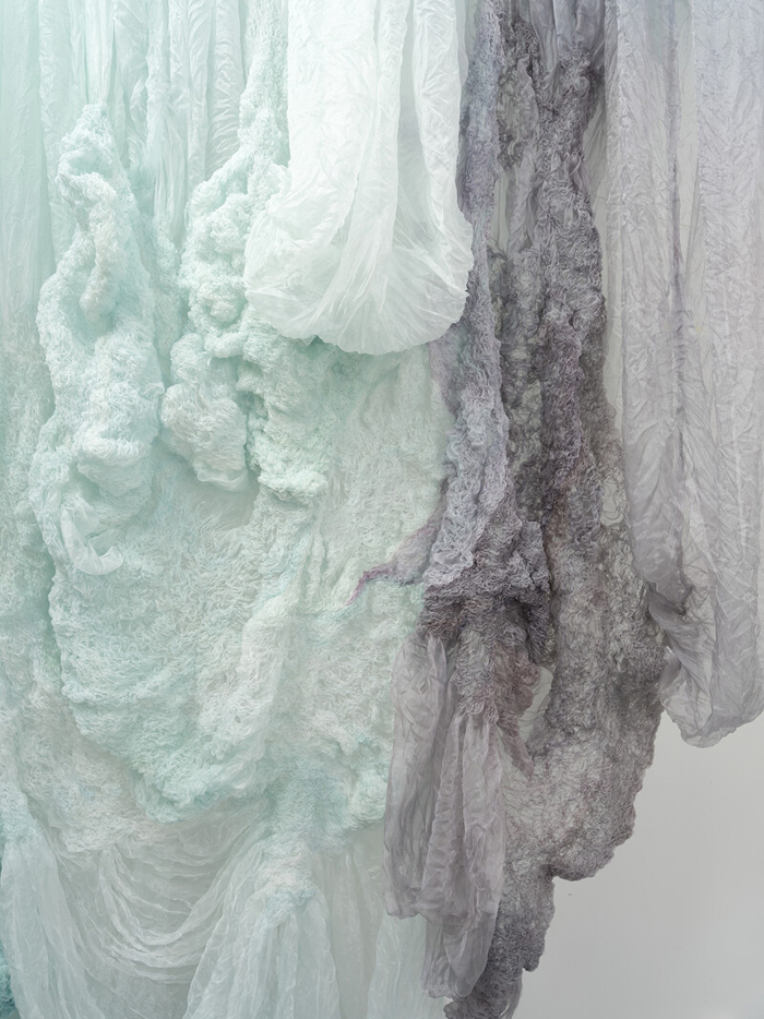 Nylon organza is made from oil and is part of the growing global pollution problem. The exhibition title FLOM (meaning flood) brings to mind the newspaper headlines we encounter ever more frequently, accompanied by photographs of rivers bursting their banks and posing new dangers; glaciers melting into rushing water; massive mudslides sweeping away cars and buildings; of people standing by helplessly as the forces of nature strike and make the world unsafe.