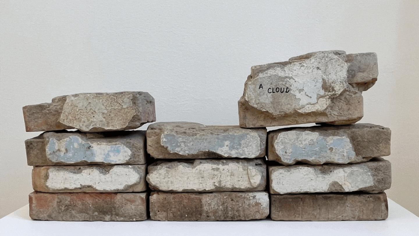 [1] Jimmie Durham, These twelve bricks were used to represent the dawn sky in Venice, 2015. Bricks, plaster, paint, ink. Courtesy of proyectoamil and Juan Carlos Verme. Photo: Amedeo Benestante. [2] Jimmie Durham, The names of the team of scientists who submitted an article on the human chromosome 14 in Nature magazine, 2003. Plywood, oak, acrylic paint, ink, metal, electical wire, sardine can, screws. Private collection. [3] Jimmie Durham, Brazilian bloodstone, 1997. Stone, orange, graphite, wood, Brazilian bloodstone, acrylic paint. Private collection. [4] View of Invitation to a pointless investigation, ViaFarini, Milan, 1997. Courtesy of Via Farini. [5] View of Jimmie Durham: humanity is not a completed project, Madre Museum, Naples, 2023. Photo: Amedeo Benestante.