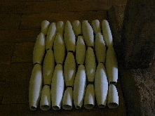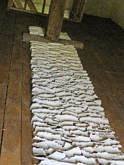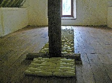 A l'étage du centre sont disposés à terre en longues bandes d'autres colombins, entiers, enroulés en fuseaux ouverts ou sous forme d'un parterre de mosaïque monochrome. Les installation de Lydia Wauters, en parfaite harmonie avec le lieu, dégagent une sensation de paix et de grande sérénité dans ce lieu coupé du monde, isolé en pleine forêt.