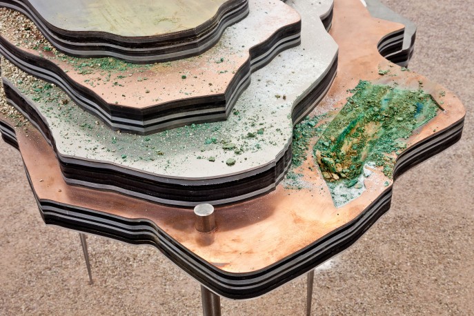 Otobong Nkanga, Solid Maneuvers, 2015. Various metals, Forex, acrylic, tar, salt, make-