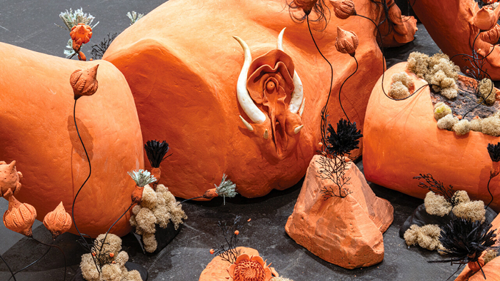 Rajni Perera and Marigold Santos, Efflorescence/The Way We Wake (detail), 2023. Polymer clay, styrofoam, paint, metallic powder, synthetic hair, pearls, steel, aluminum, floral foam, paper, plastic, 152.4 x 243.8 x 121.9 cm. Photo: Mikhail Mishin. Courtesy of the artists and Patel Brown Gallery