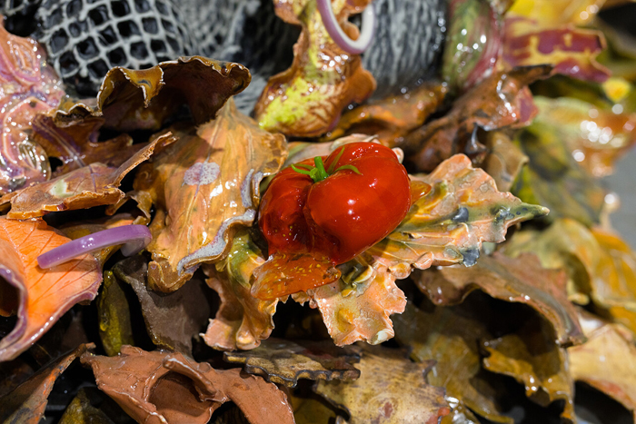 Barbecue is a site-responsive installation that both distills and magnifies core elements central to Manson’ work. Comprised of thousands of individually crafted ceramic leaves, flowers, a barbecue grill, and assorted detritus that swell into piles, Barbecue allows for moments of self-reflection. The mounds, some standing over six feet high, are piled against the walls of the ellipse, creating a path inviting visitors to explore the space. Manson’ visual language derives from nature but elicits the complexities of human experience, evoking universal questions about life, mortality, anxiety, nostalgia, memory, and humanity’ connection to nature. The leaves not only relate to the cyclical nature of a person’ life, changing from one season to another, but also to the internal struggle to either collect and contain one’ emotions or release them.