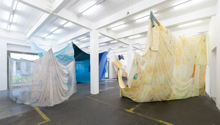 The exhibition title plays with two versatile concepts. Zustand, German for current state, hints at the ephemerality of Pulfer’s tent-like installations, shape-shifting in every show and often repurposed for newer arrangements. Zustand also refers to the state of mind that Pulfer’s works evoke by creating spaces of affect. Fach, a technical term from weaving, is dedicated to the centuries-old textile tradition of the St.Gallen region. In preparation for this solo show, Pulfer familiarised himself with weaving techniques, acquiring both a weaving frame and a loom. Fach is the term used to describe the shed, which is the temporary opening created between the warp yarns through which the weft is woven. It is a poetic and even musical space, dynamically opening and closing amidst taut strings. Fach also refers to field of expertise, considering that Pulfer’s self-taught practice spans many techniques and approaches.