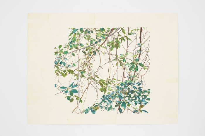 Khedoori then does immensely detailed drawings in graphite and oil paints, which are extraordinarily precise in their execution. Her motifs range from buildings, windows, cinema seats, and fireplaces to branches, grasses, clouds, horizon lines, and more. Human beings are only ever present in the traces they leave; they are never the prime focus of a composition. In many works, the motifs are detached from their original context and occupy an expansive, empty pictorial space. Time and place appear not to apply in these realms. This, in turn, creates a situation where certain works develop moments of abstraction, which open up yet another dimension in Khedoori’s art.